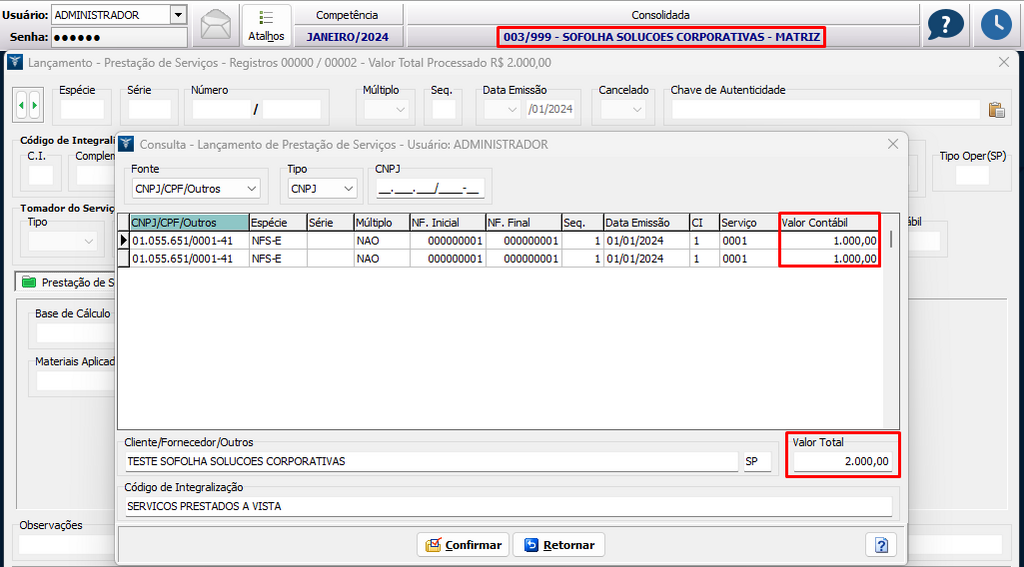 6. Na consolidada, podemos observar os lançamentos feitos anteriormente na matriz e na filial;