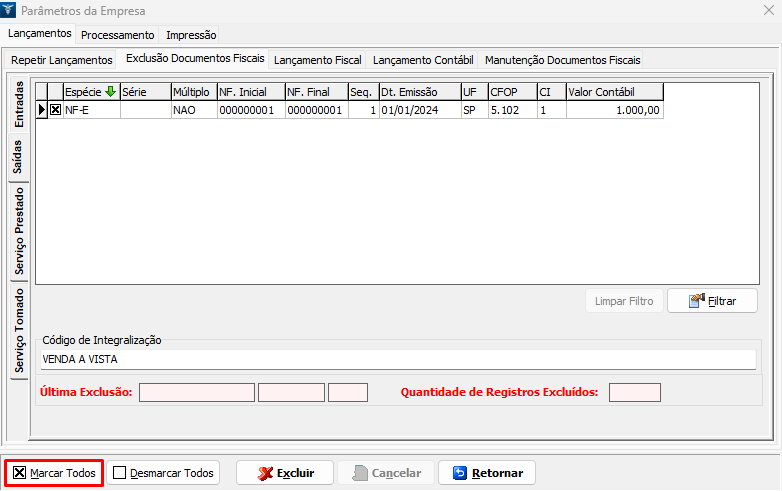 4. Utilize a opção Marcar Todos para a exclusão de todos os lançamentos no livro selecionado. A exclusão é efetuada por competência, ou seja, acessando cada mês correspondente;