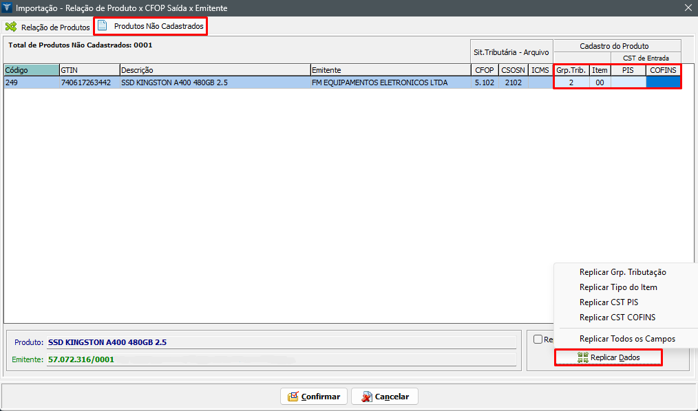 12. Em seguida, acesse a palheta Produtos Não Cadastrados, pressione F9 sobre cada campo configurado como obrigatório e informe a opção desejada, conforme exemplo;