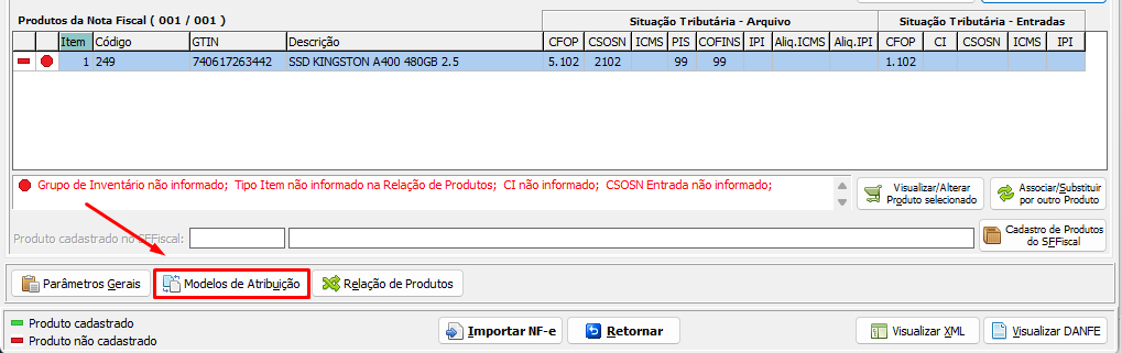 14. Confirme e retorne na tela principal, caso ocorram erros, estes serão apresentados abaixo do Produto da Nota Fiscal em vermelho.