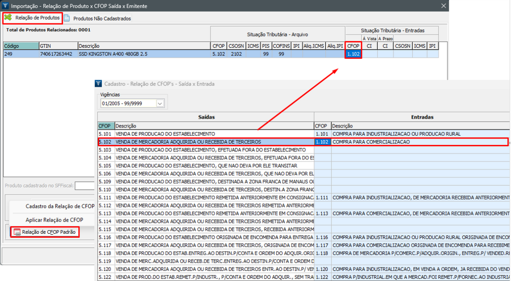 No exemplo, temos o CFOP de origem 5.102, que será importado/escriturado no CFOP Entrada 1.102;
