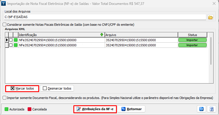 4. Os arquivos serão listados para a importação, clique em Marcar Todos, e após Atribuições da NF-e;
