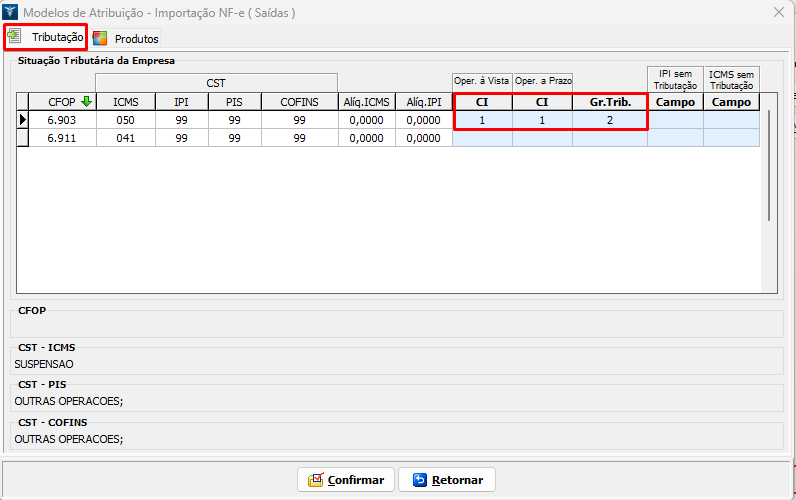 6. Na palheta Tributação indique o CI a vista e CI a prazo, Grupo de Tributação, pressione F9 sobre cada campo para informá-los. Esta parametrização deve ser efetuada para cada CFOP apresentado nesta tela;