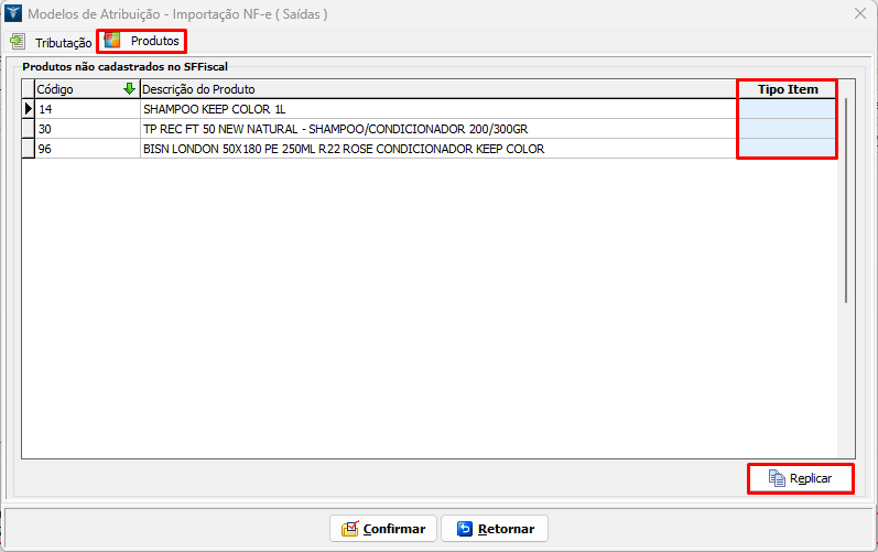 7. Após na palheta Produtos, informe o Tipo do Item, se necessário pode usar a opção Replicar abaixo da tela;