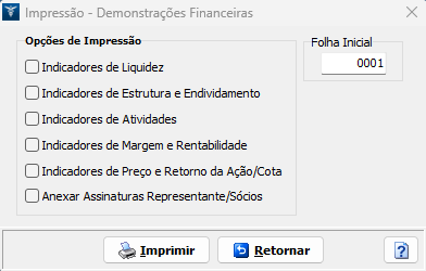5. Após as parametrizações, acesse Impressão > Análise > Demonstrações Financeiras. Selecione os indicadores desejados na impressão;