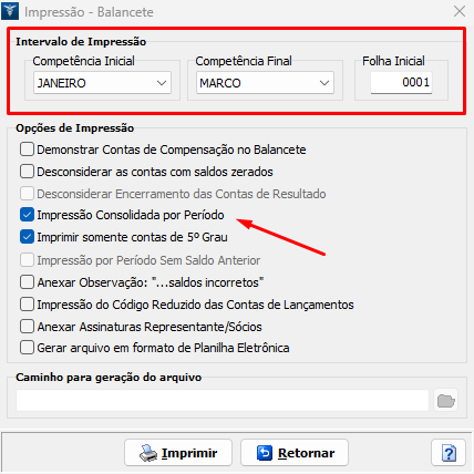 3. O sistema permite a impressão do Balancete Consolidado no período, para isso indique a Competência Inicial e Final, em seguida selecione a opção Impressão Consolidada por Período. Se desejar, marque Imprimir somente contas de 5° grau, conforme exemplo.