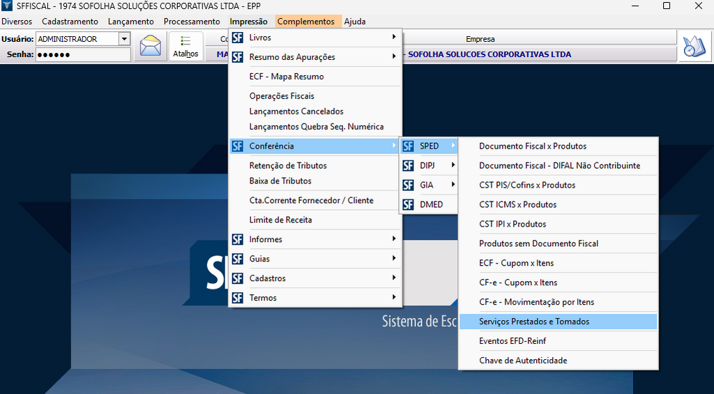 1. Na tela inicial do sistema, acesse o menu Impressão > Conferência > Sped > Serviços Prestados e Tomados;