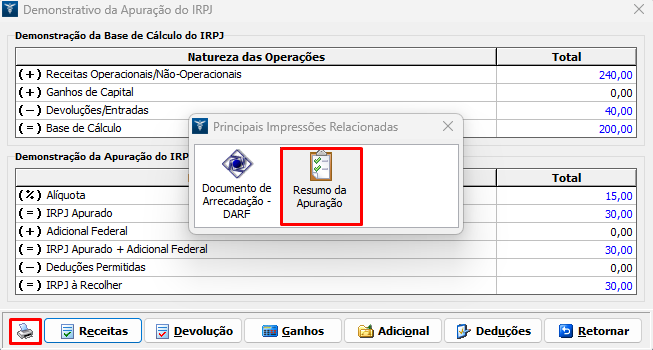 Para efetuar a impressão do Resumo das Apurações de IRPJ e CSLL, siga os procedimentos abaixo: