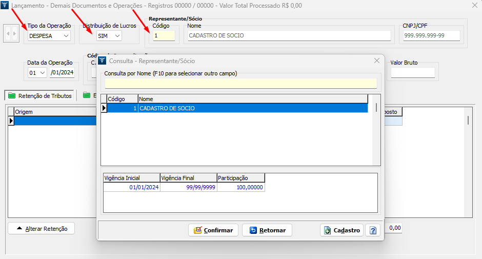 2. Clique em Incluir, informe em Tipo de Operação: Despesa e Distribuição de Lucros: Sim. Pressione F9 no campo Representante/Sócio e selecione o sócio desejado;