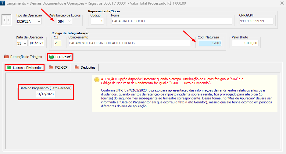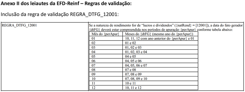 A Receita Federal publicou a Nota Técnica 04/2023 da EFD Reinf para auxiliar a forma de envio dessas informações: se a Natureza de Rendimento for Lucros e Dividendos 12001, a data do fato gerador deve estar compreendida nos períodos de apuração conforme tabela abaixo: