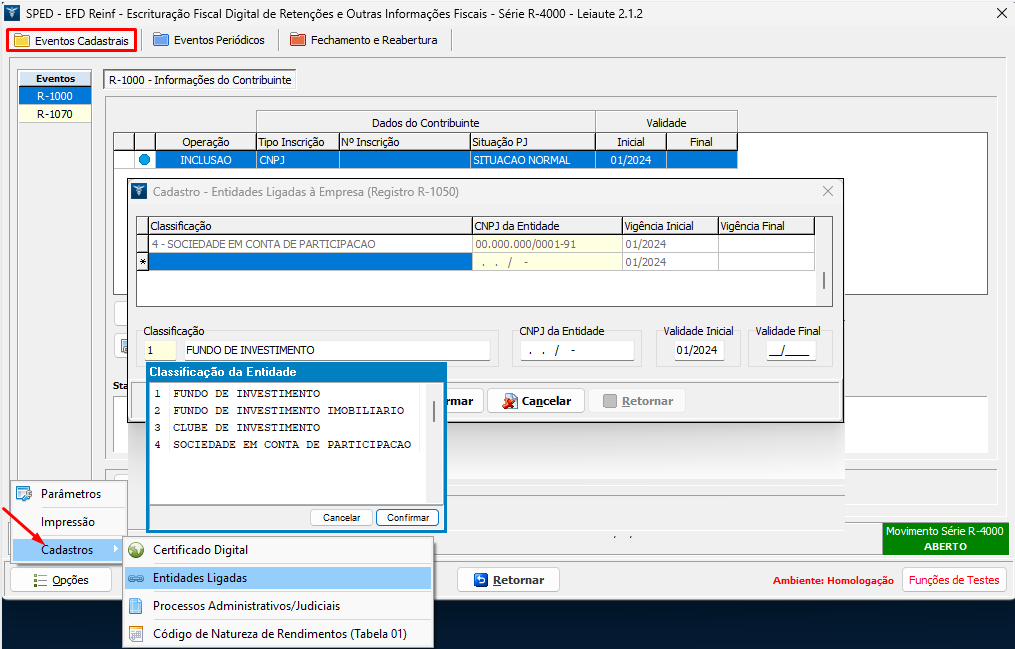 2. Em seguida, acesse a aba Eventos Cadastrais, e no canto inferior esquerdo, selecione Opções > Cadastros > Entidades Ligadas, conforme o exemplo: