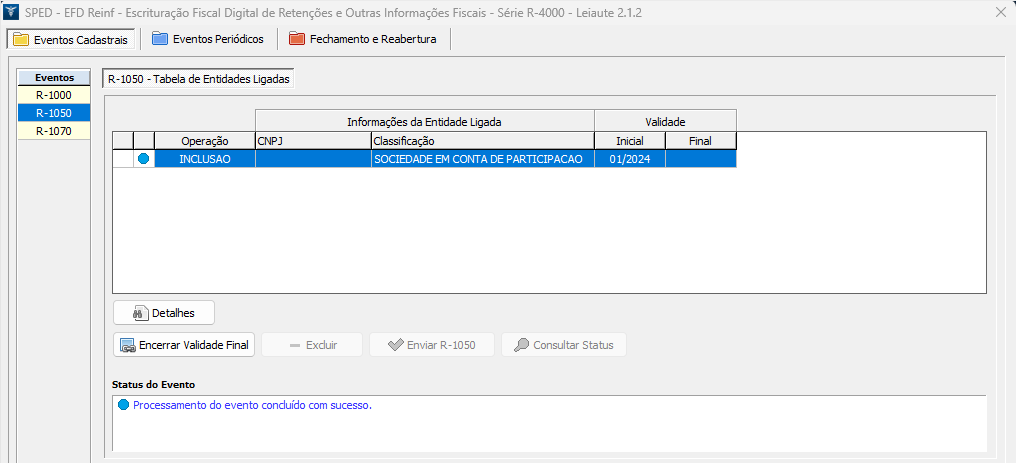 4. O evento será habilitado e poderá ser enviado clicando na opção Enviar R-1050;
