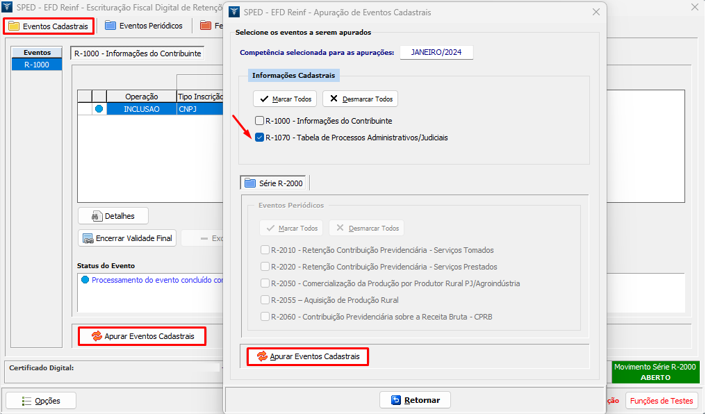 3. Na aba Eventos Cadastrais, clique em Apurar Eventos Cadastrais. Selecione o evento R-1070 e clique em Apurar Eventos Cadastrais;