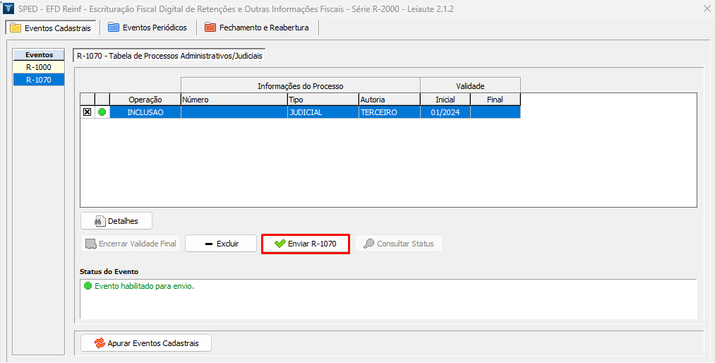 4. O evento será habilitado e poderá ser enviado clicando na opção Enviar R-1070;
