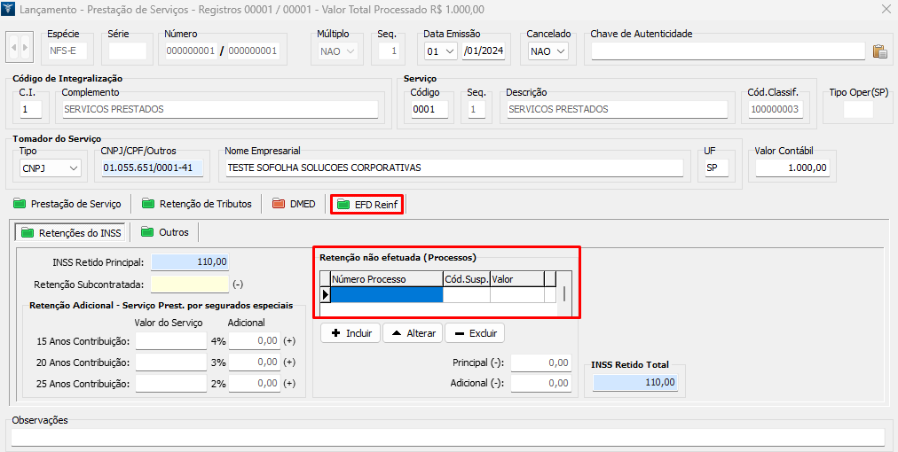 5. Após o processamento do evento R-1070 concluído, o processo poderá ser vinculado ao lançamento desejado, através da aba EFD Reinf, conforme o exemplo: