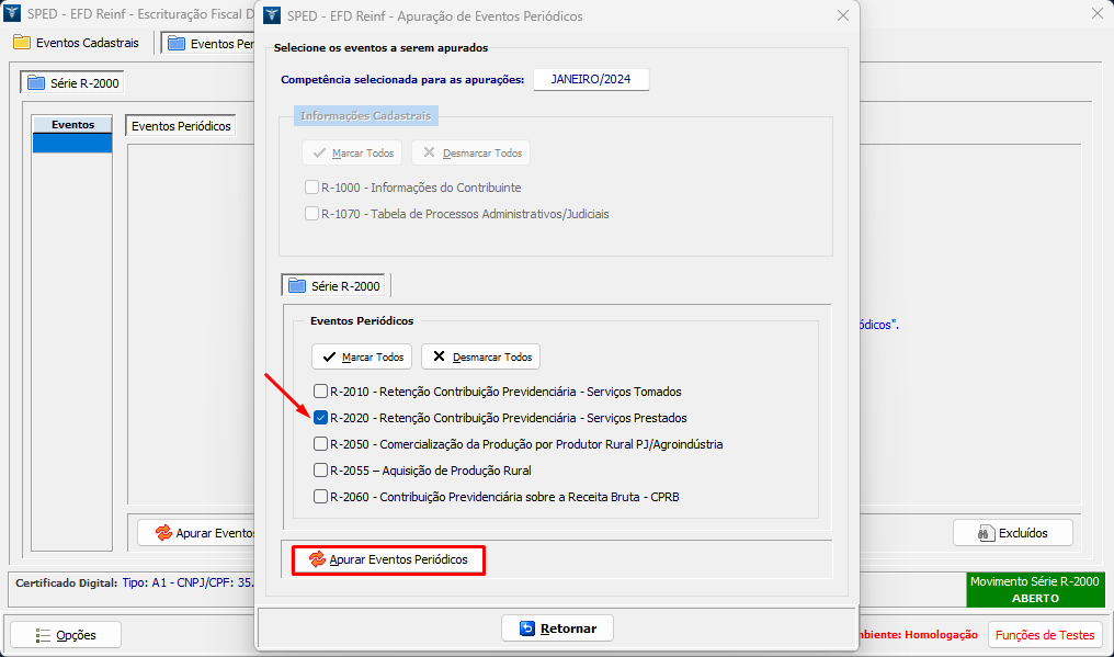 8. Na tela seguinte, marque o evento R-2020 e clique em Apurar Eventos Periódicos;