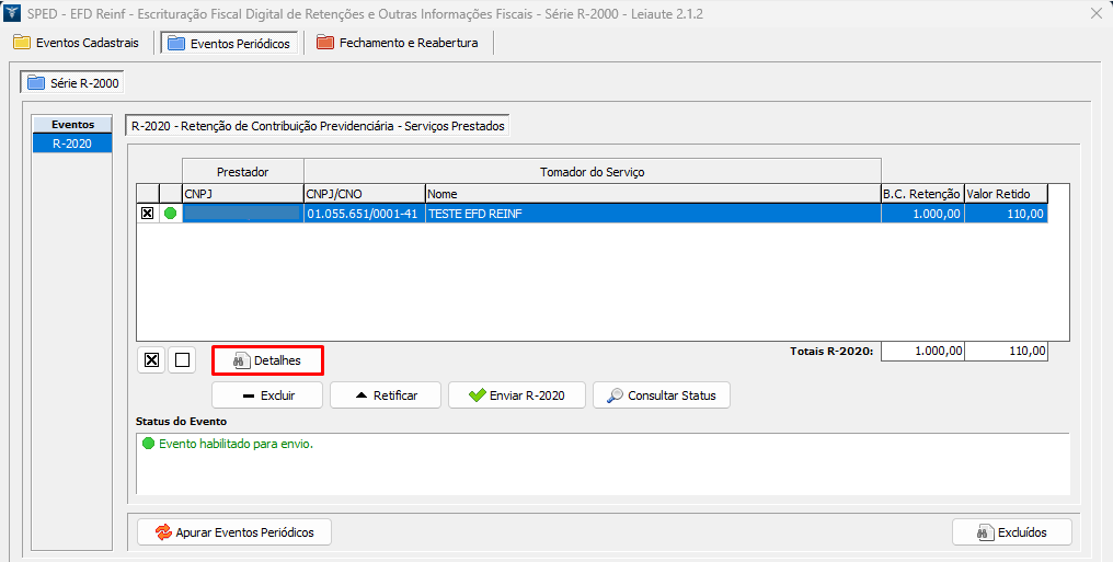 9. O evento será habilitado para envio. Na opção Detalhes confira se todas as informações foram geradas corretamente;