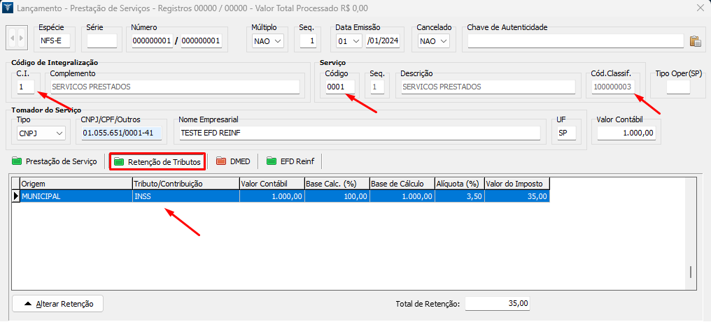 4. Clique em Incluir no rodapé da tela e dê início ao lançamento, informando cada campo conforme o documento fiscal. Observe no exemplo abaixo, cada informação apresentada foi devidamente parametrizada nas opções anteriores. Na palheta Retenção de Tributos confirme se o valor foi gerado corretamente;