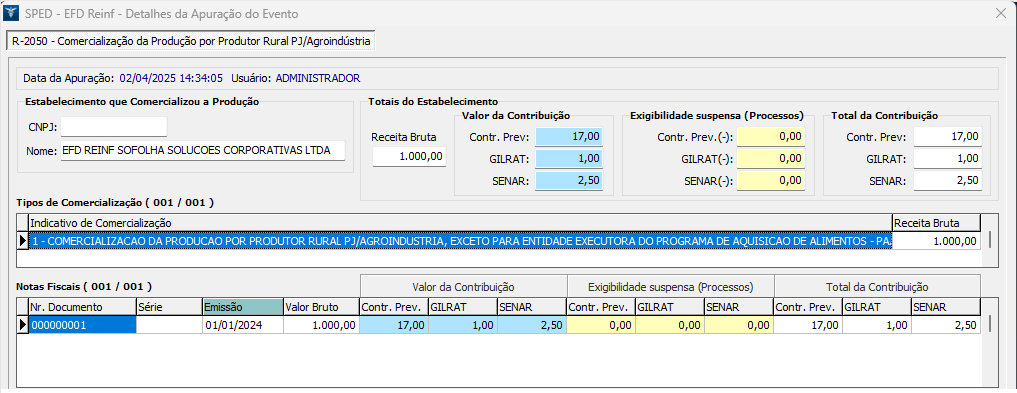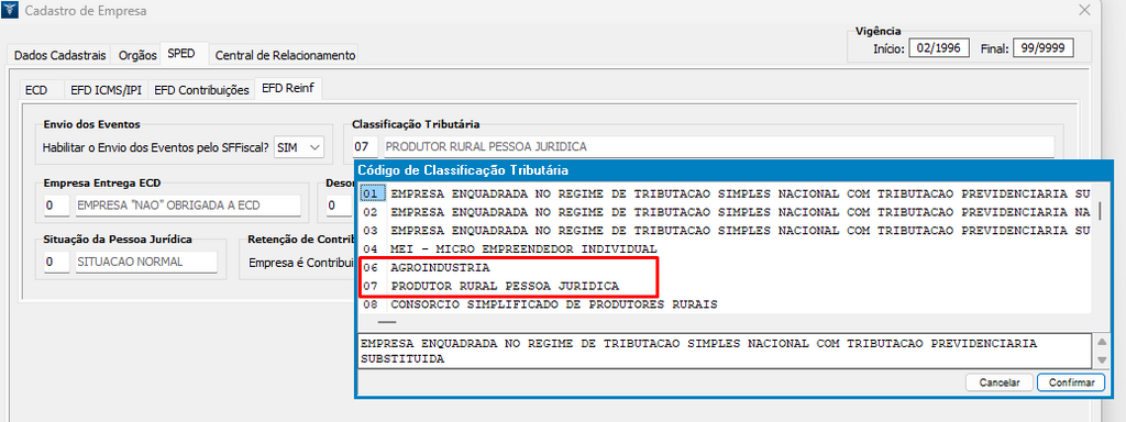 Para gerar o registro R-2050, a Classificação Tributária da empresa corresponderá à opção 06 Agroindústria ou 07 Produtor Rural Pessoa Jurídica;