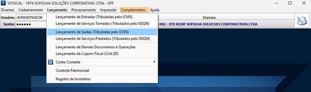 1. Na tela principal do sistema, acesse o menu Lançamento > Lançamento de Saídas;