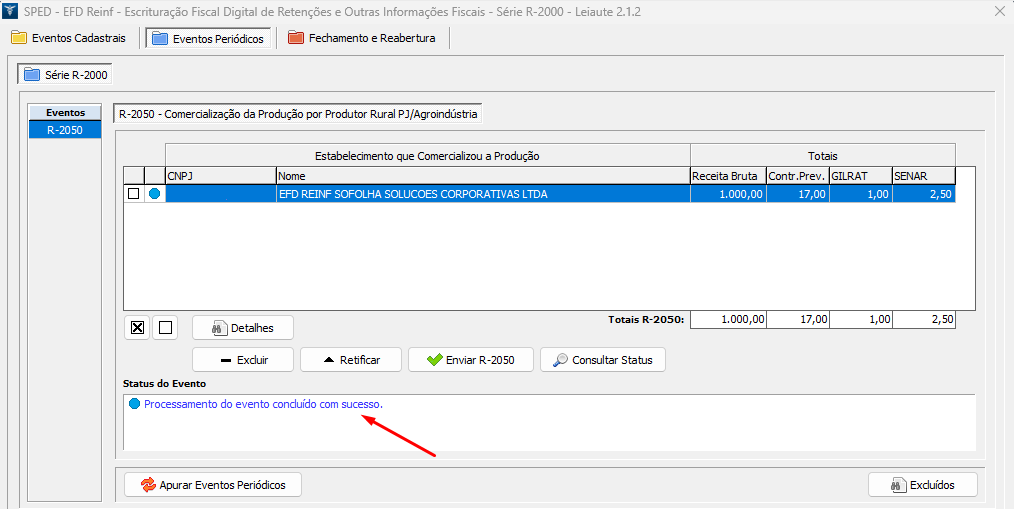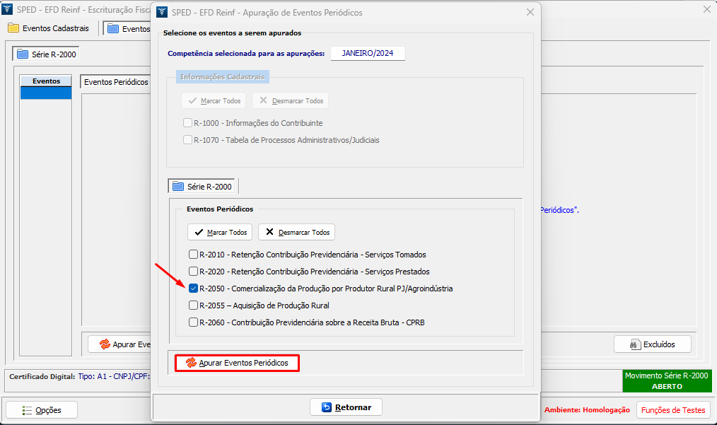 5. Na tela seguinte, marque o evento R-2050 e clique em Apurar Eventos Periódicos;
