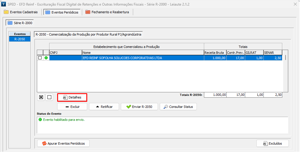 6. O evento será habilitado para envio. Na opção Detalhes confira se todas as informações foram geradas corretamente;