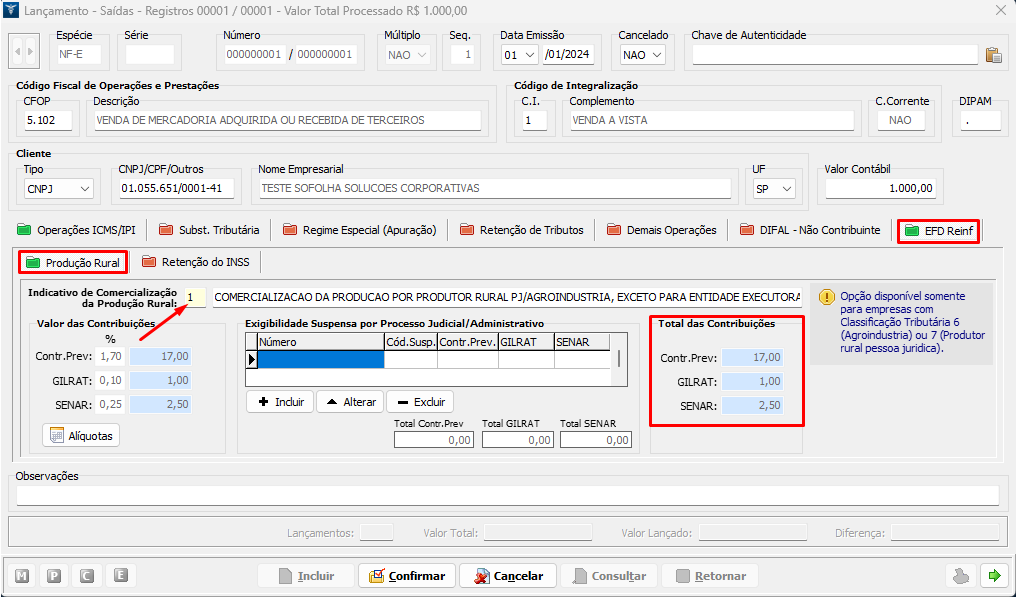 2. Clique em Incluir no rodapé da tela e dê início ao lançamento, informando cada campo conforme o documento fiscal. Observe no exemplo abaixo, a palheta EFD Reinf > Produtor Rural será habilitada, pressione F9 no campo Indicativo de Comercialização da Produção Rural e selecione a opção desejada. As contribuições serão geradas de acordo com o indicativo selecionado.