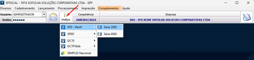 1. Na tela principal do sistema, acesse o menu Atalhos > EFD Reinf > Série 2000;