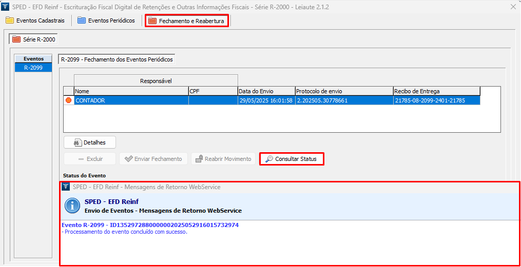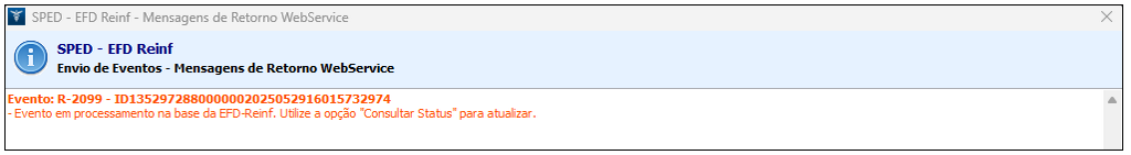 3. Retorne e clique em Consultar Status. O processamento do evento será concluído com sucesso;