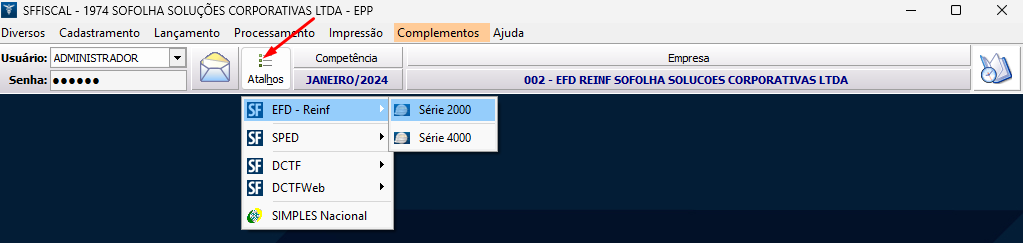 1. Na tela principal do sistema, acesse o menu Atalhos > EFD Reinf > Série 2000;