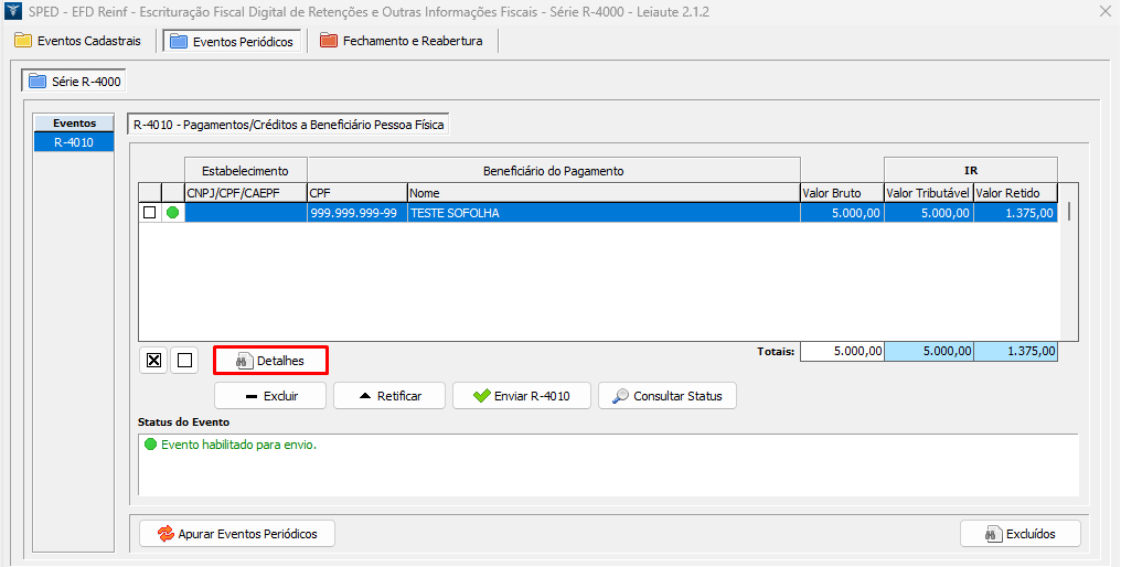 7. O evento será habilitado para envio. Na opção Detalhes confira se todas as informações foram geradas corretamente;