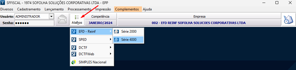 4. Na tela principal do sistema, acesse o menu Atalhos > EFD Reinf > Série 4000;