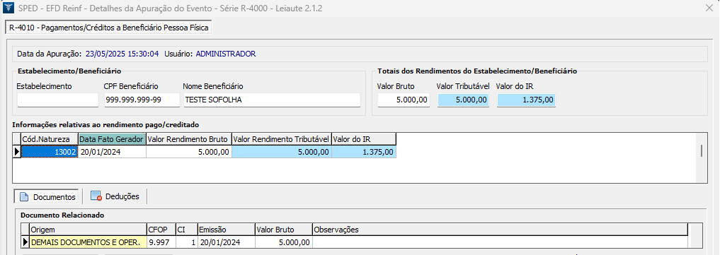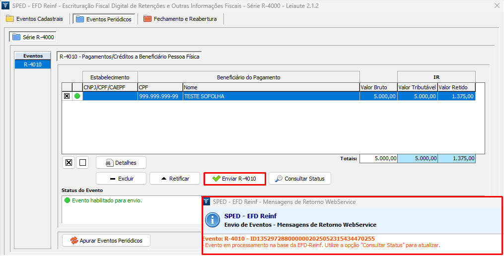 8. Retorne, selecione o evento e clique na opção Enviar R-4010. O Evento ficará em processamento na base da EFD Reinf;