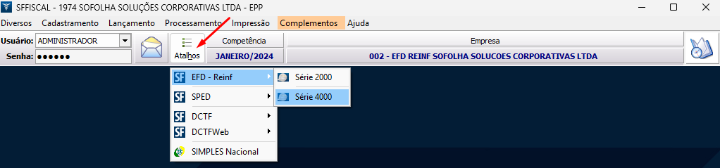 4. Na tela principal do sistema, acesse o menu Atalhos > EFD Reinf > Série 4000;