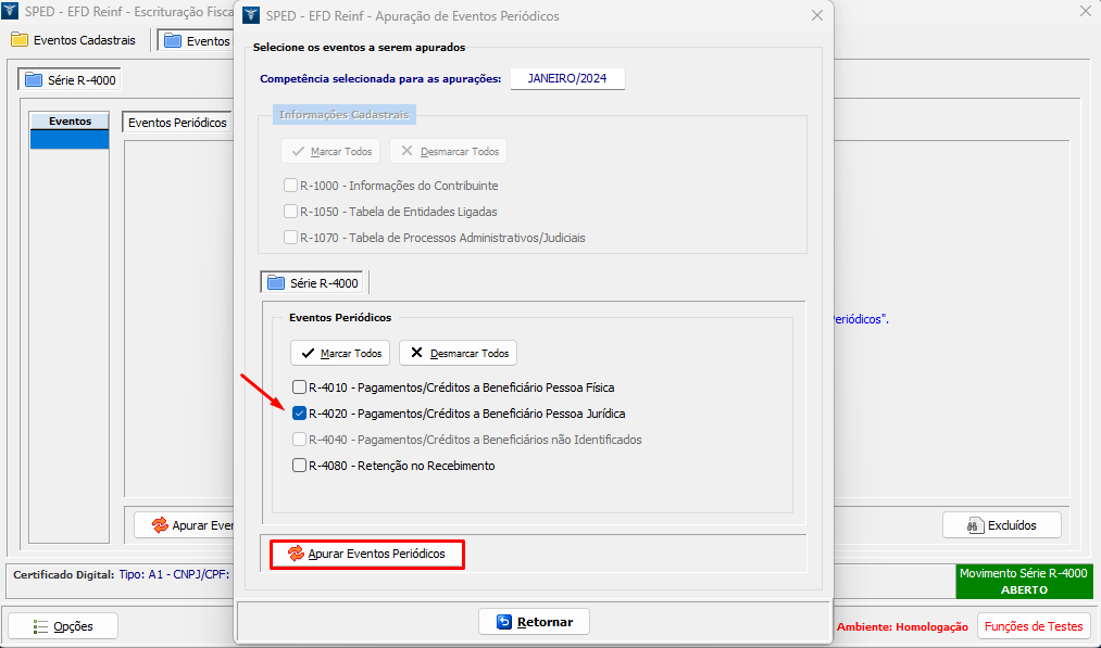 6. Na tela seguinte, marque o evento R-4020 e clique em Apurar Eventos Periódicos;