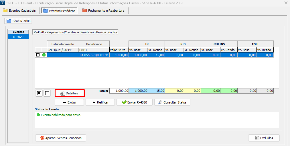 7. O evento será habilitado para envio. Na opção Detalhes confira se todas as informações foram geradas corretamente;