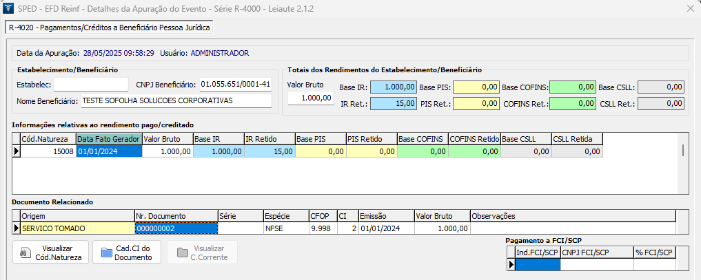 O evento R-4020 - Pagamentos/créditos a beneficiário pessoa jurídica é aquele pelo qual são enviadas as informações referentes a pagamento, efetuado por fonte pagadora pessoa física ou jurídica a beneficiário pessoa jurídica, mesmo sem retenção de imposto de renda, nos casos previstos na legislação.
