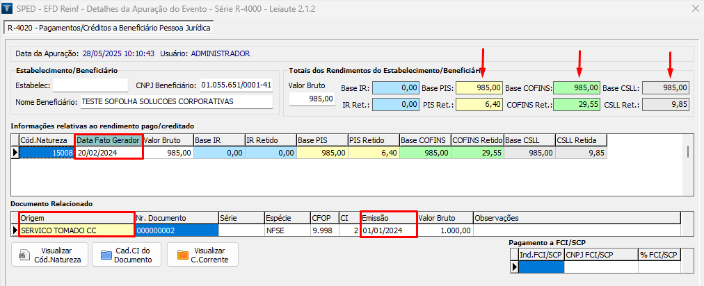 8. Observe o exemplo abaixo: a data de emissão da nota fiscal é 01/01/2024, porém existem retenções federais (PIS, Cofins, CSLL) geradas pela Conta Corrente. Essas retenções serão geradas pela data do fato gerador, que, no exemplo, é o pagamento da baixa realizada em 20/02/2024. Dessa forma, as retenções geradas serão enviadas na EFD-Reinf, competência 02/2024.