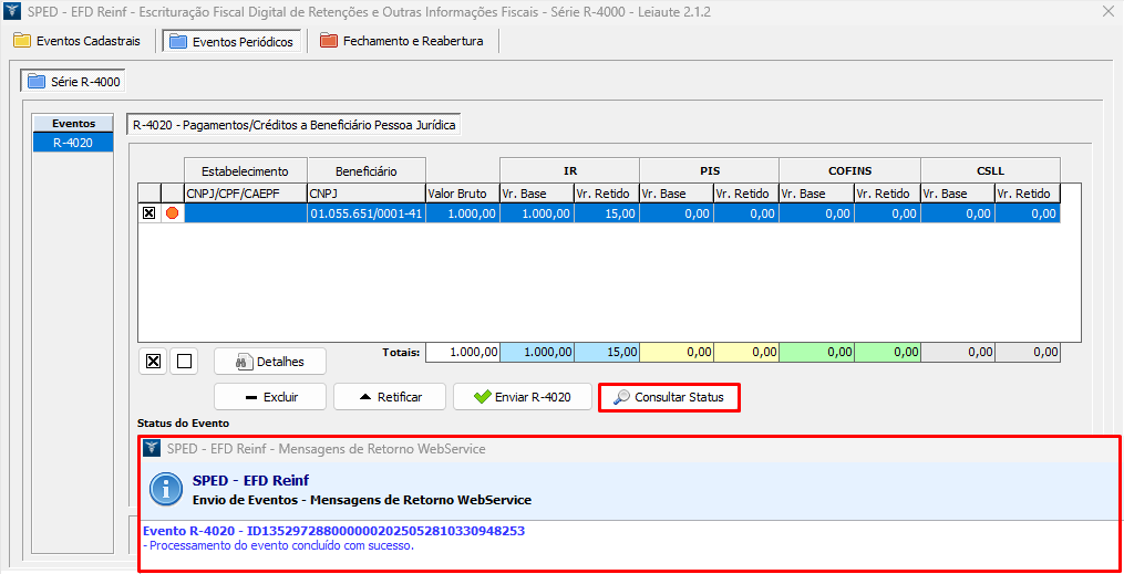 9. Retorne, selecione o evento e clique na opção Enviar R-4020. O Evento ficará em processamento na base da EFD Reinf;