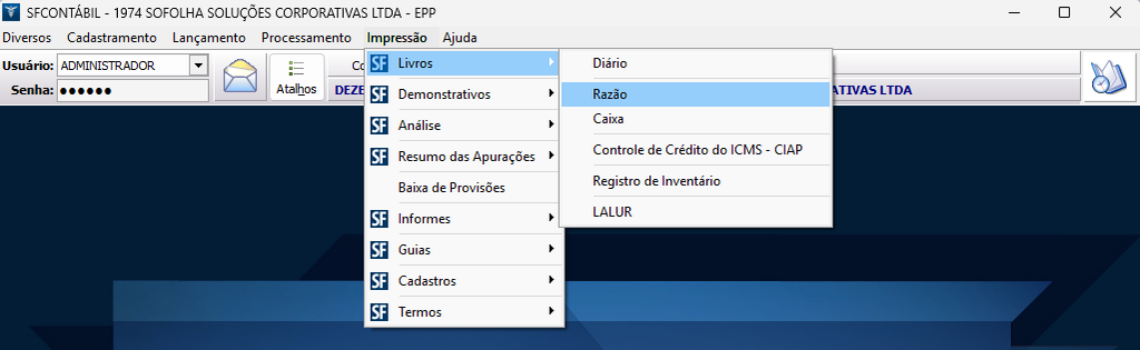 1. Na tela principal do sistema, acesse o menu Impressão > Livros > Razão;