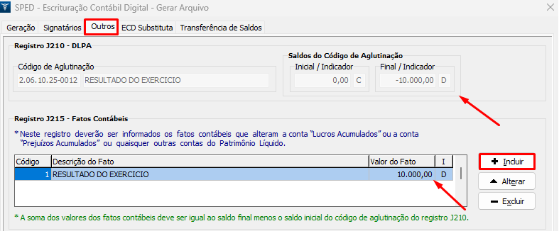 9. Na palheta Outros, no Registro J210, o sistema carrega o Resultado do Exercício, conta de 5º grau, grupo 2.06.10.XXX e seu saldo correspondente;