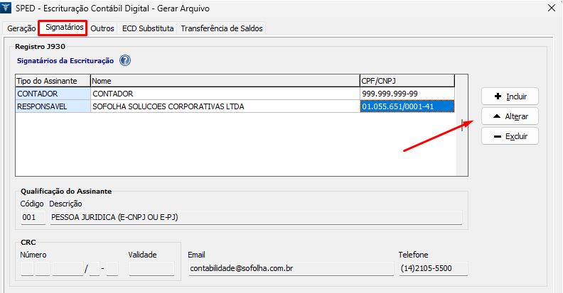 8. Na palheta Signatários terá o J930 com os responsáveis pela assinatura da escrituração ECD. O sistema permite a alteração e inclusão dos assinantes;