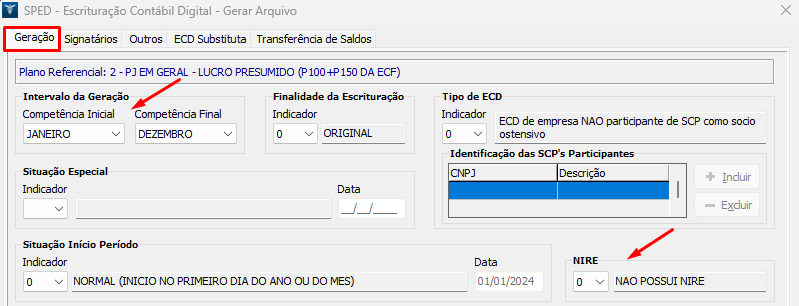4. No campo NIRE selecione 0 - NÃO POSSUI NIRE ou 1 - POSSUI NIRE;
