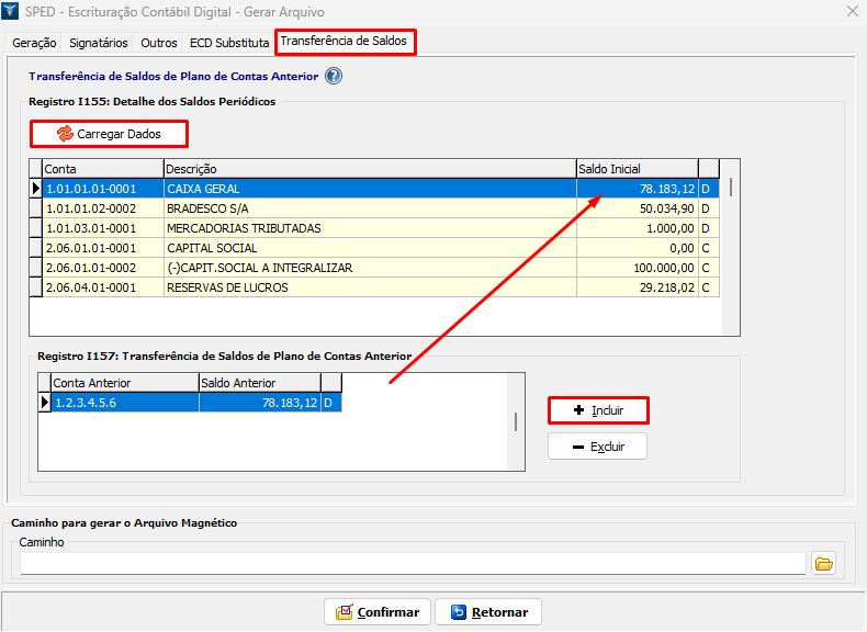 5. Observe no exemplo abaixo a conta CAIXA GERAL, no Registro I157 a Conta Anterior foi cadastrada, com o saldo implantado na empresa. Efetue o processo com a demais contas;