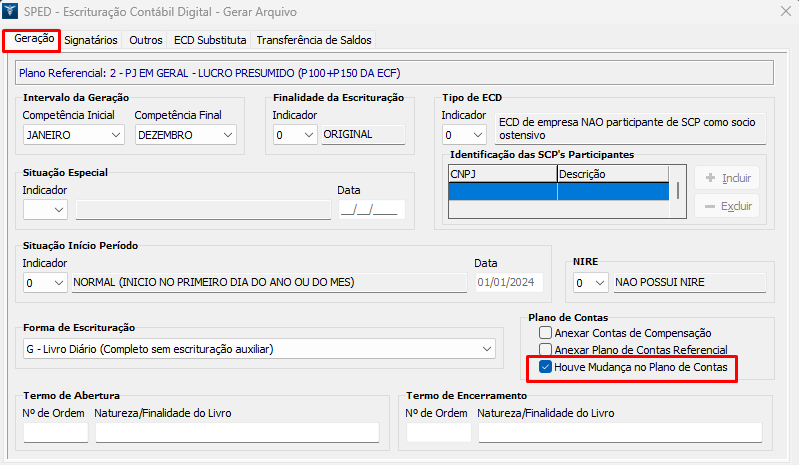 3. Para a geração da ECD com este registro, na tela inicial, na opção Plano de Contas, indique que Houve Mudança no Plano de Contas da empresa;