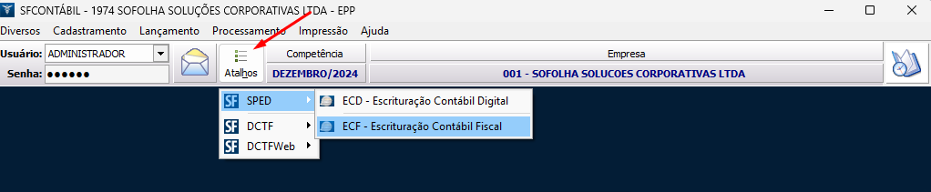 2. Em seguida, acesse o menu Atalhos > Sped > ECF. A geração do arquivo da ECF também está disponível no módulo SFFiscal;