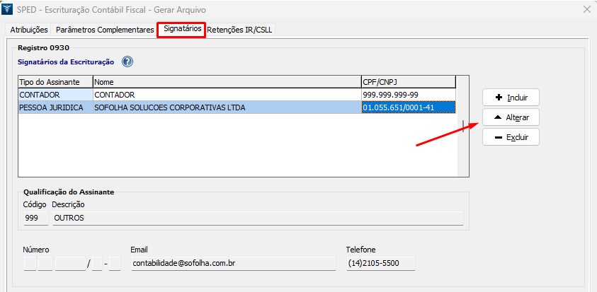 6. Na palheta Signatários terá o registro 0930 com os responsáveis pela assinatura da escrituração ECF. O sistema permite a alteração e inclusão dos assinantes;