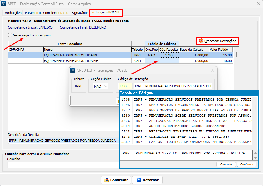 7. Na palheta Retenções IR/CSLL terá o registro Y570 - Demonstrativo do Imposto de Renda e CSLL Retidos na Fonte, clique em Processar Retenções, em seguida no campo Cód. Receita poderá informar o código correspondente, conforme exemplo. Marque a opção Gerar registro no arquivo;