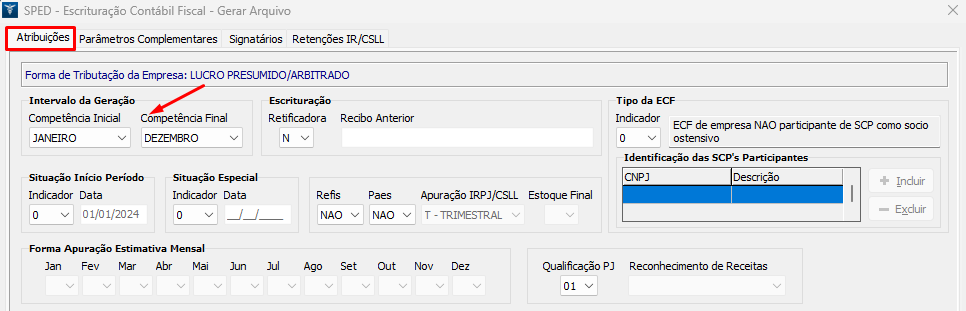 3. Na tela apresentada, na palheta Atribuições, informe a Competência Inicial e Competência Final. Demais campos serão informados nas condições especiais de geração do arquivo;