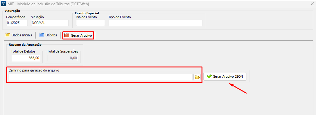 6. Em seguida, acesse a palheta Gerar Arquivo, indique o caminho/pasta que o arquivo será salvo, clique em Gerar Arquivo JSON;